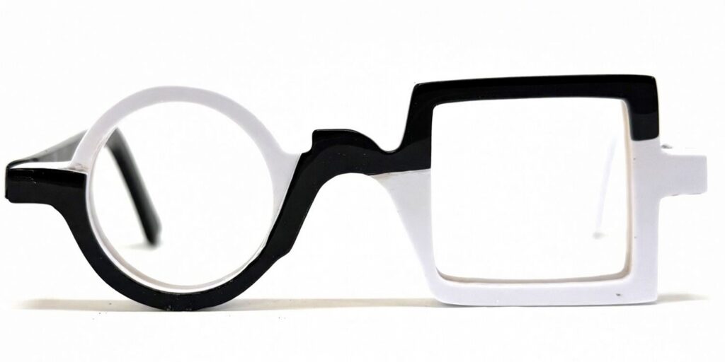 Cette monture de lunettes asymétrique en acétate noir et blanc se distingue par son design unique associant une forme ronde et une forme carrée. Moderne, graphique et audacieuse, elle s’adresse aux amateurs de lunettes originales qui souhaitent affirmer leur style.